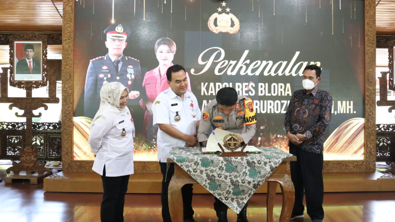 Kemudian selanjutnya, Kapolres AKBP Fahrurozi beserta istri Ny. Jean Fahrurozi menghadiri undangan perkenalan Kapolres Blora yang digelar di Pendopo Rumah Dinas Bupati Blora.