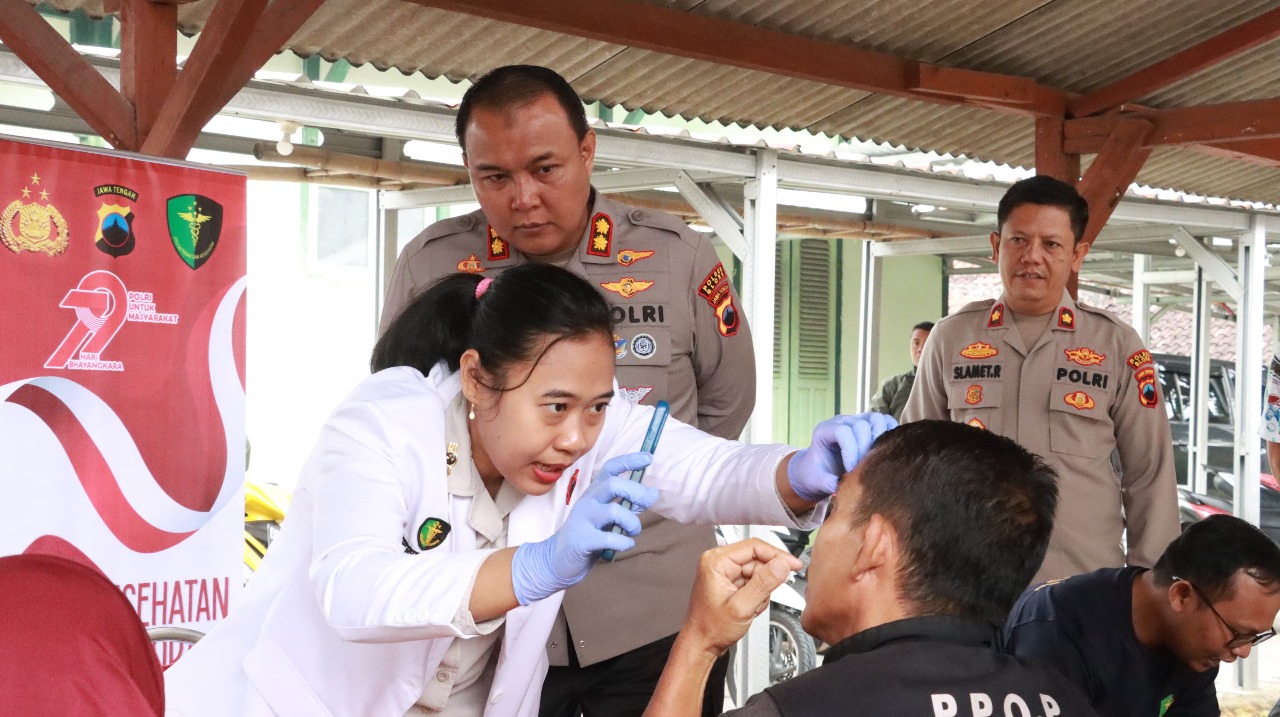 BLORA – Dalam rangka memperingati Hari Bhayangkara ke-79, Polres Blora melalui Seksi Dokter dan Kesehatan (Sidokkes) menggelar pemeriksaan kesehatan gratis bagi 50 pengemudi ojek daring (ojol) di Polsek Cepu, Jumat (13/6/2025). Kegiatan bakti sosial ini dipimpin langsung oleh Kapolres Blora AKBP Wawan Andi Susanto, S.H., S.I.K., M.H., didampingi Wakapolres Kompol Slamet Riyanto, Kapolsek Cepu AKP Edi Santosa, serta Kasidokkes Polres Blora dr. Kusumaningrum. Aksi ini menjadi wujud nyata kepedulian Polri terhadap masyarakat, khususnya para pekerja transportasi daring yang menjadi tulang punggung mobilitas masyarakat.