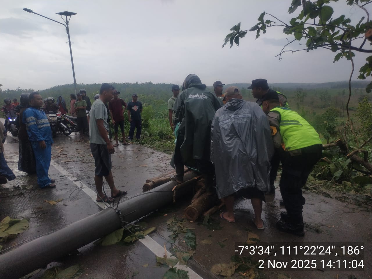 BLORA – Hujan lebat disertai angin puting beliung pada Minggu (02/11/2025) sekitar pukul 13.30 WIB di wilayah Banjarejo, Blora, menyebabkan bencana alam yang memutus akses jalan utama. Sebanyak dua tiang listrik roboh melintang di ruas Jalan Raya Banjarejo – Randublatung, tepatnya di Desa Sidomulyo, yang sontak menyebabkan kemacetan total arus lalu lintas.