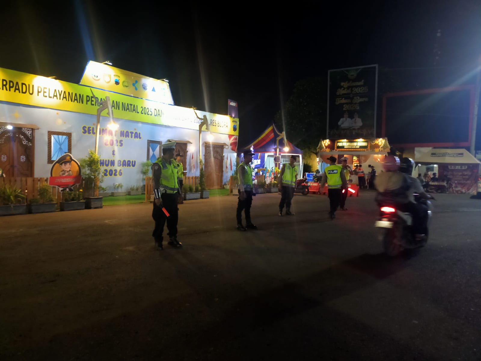 BLORA – Menjelang pergantian tahun, intensitas kendaraan di pusat Kota Blora mulai menunjukkan peningkatan. Guna menjamin kelancaran arus lalu lintas, personel Kepolisian Resor (Polres) Blora yang bersiaga di Pos Terpadu Alun-Alun melakukan penjagaan dan pengaturan (Gatur) lalu lintas secara intensif pada Selasa (30/12/2025) malam.
