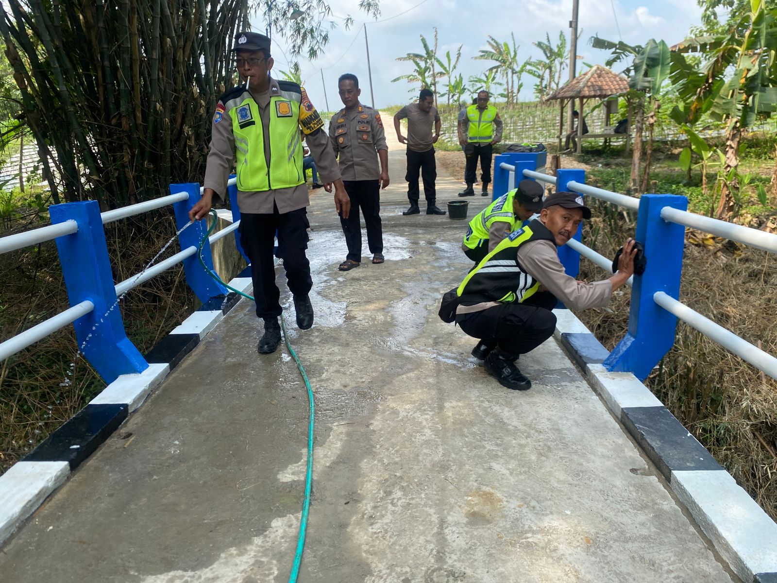 > “Hari ini kami melaksanakan kerja bakti perbaikan dan pembersihan area jembatan. Jembatan ini adalah urat nadi penghubung antara Desa Sumberejo dan Desa Jetakwanger, terutama bagi anak-anak sekolah. Rencananya sore nanti pukul 15.00 WIB, jembatan ini akan diresmikan langsung oleh Bapak Kapolres Blora,” ungkap AKP Lilik Eko Sukaryono.